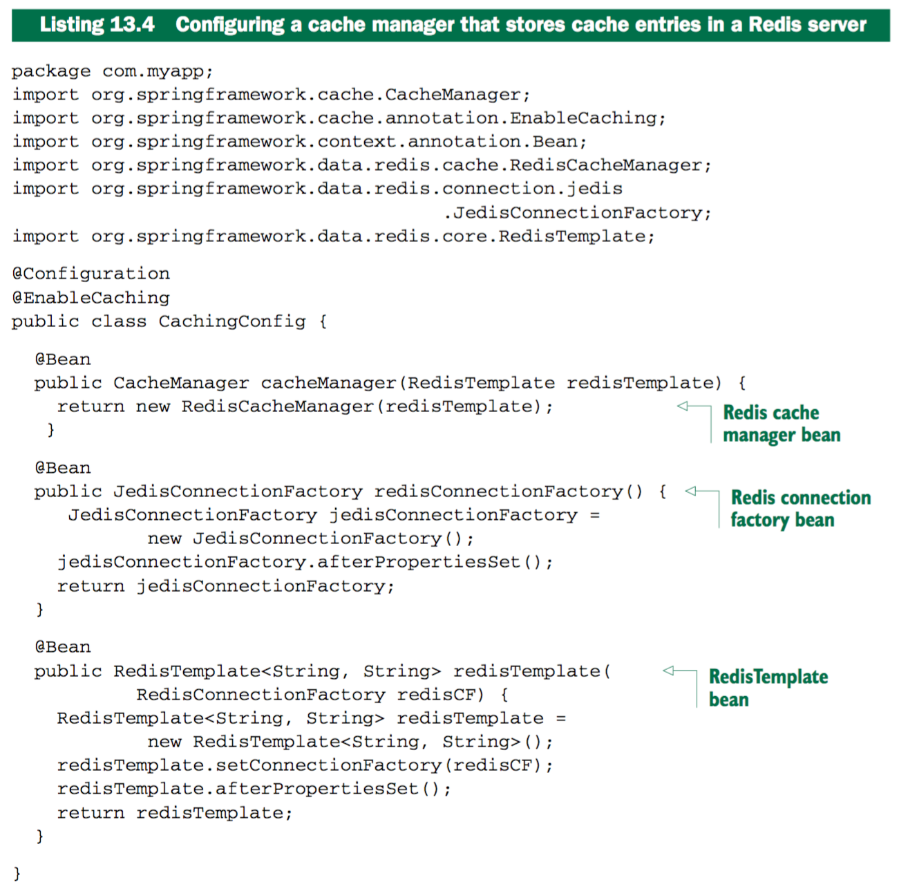To use RedisCacheManager, you’ll need a RedisTemplate bean and a bean that’s an implementation of RedisConnectionFactory (such as JedisConnectionFactory).